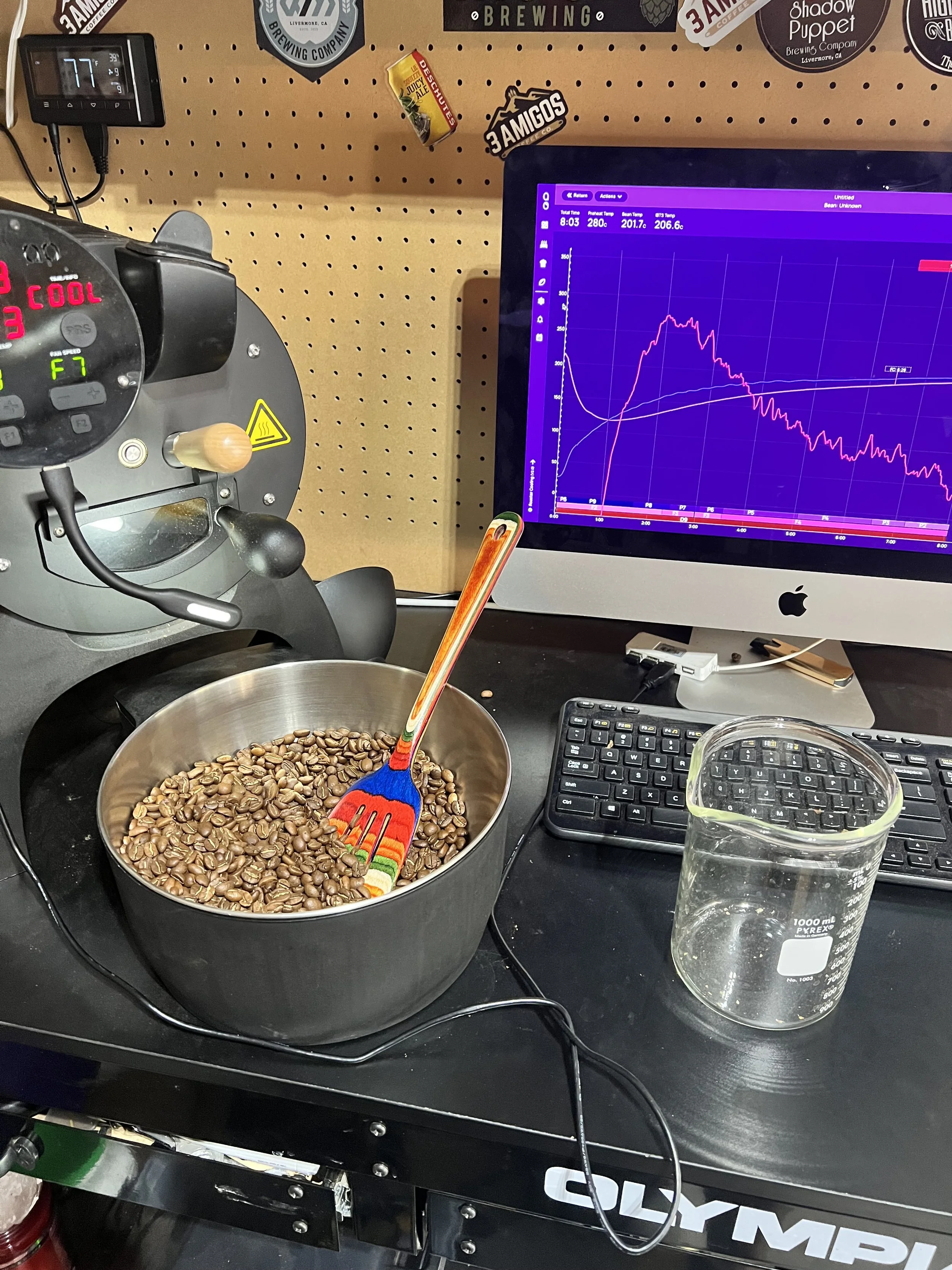 This is my small-batch roasting setup, where craft meets precision. Using a one-kilogram roaster connected to tracking software, I monitor temperature curves, airflow, and development time to ensure consistency and quality in every roast. The process blends technical control with sensory awareness, requiring focus, patience, and continual refinement. What started in my garage became a space where passion, discipline, and entrepreneurship come together.